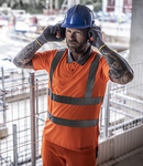 50% recycled polyester/50% polyester. Conforms to EN ISO 20471: 2013 + A1: 2016 class 2.RIS-3279-TOM (orange only).Soft touch, wicking micro mesh.UPF 40+ protection.Contrast ribbed collar.Taped neck.Two contrast button placket.Two reflective bands on front, back and one over each shoulder.Side vents.Twin needle sleeves and hem.Branded tab on lower left side seam.